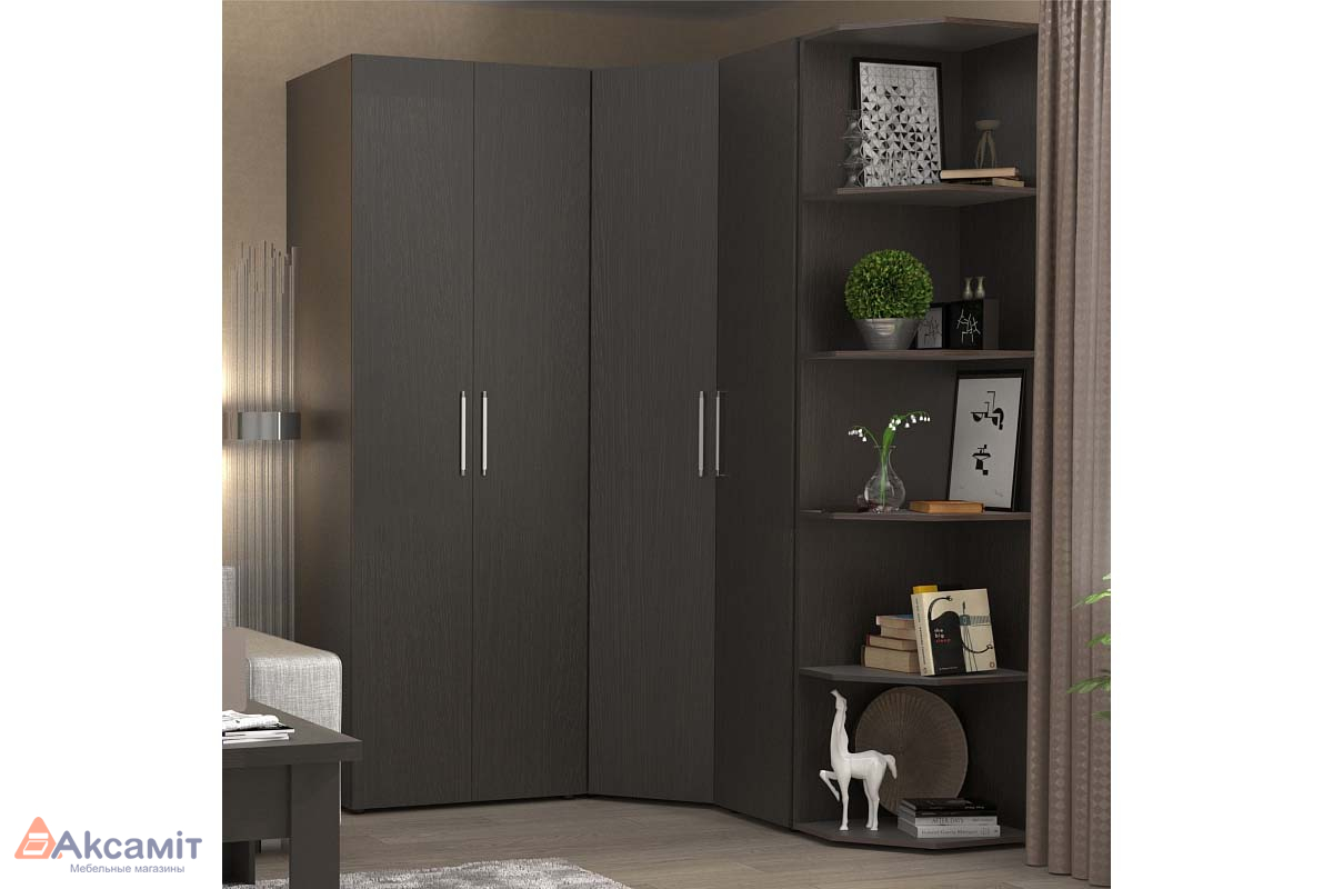 Прекрасным завершением шкафной группы выступит открытая угловая полка, которая прекрасно подойдет для хранения книг, цветов или красивой посуды в спальне или гостиной. Полки способны выдержать нагрузку до 12 кг. Для надежности конструкция крепится на стену за подвесы, а возможность сборки на правую и левую стороны делает ее универсальной.