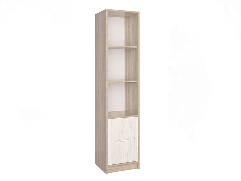Компактный шкаф-стеллаж размером 40х182 см подойдет для размещения в офисе, жилой комнате или гостиной. Конструкция изготовлена из ЛДСП в цветовой комбинации дуб сонома/дуб белый, имеет три открытые и две закрытые полки. Отделение с распашной дверцей комплектуется удобной металлической ручкой в цвете “хром”.