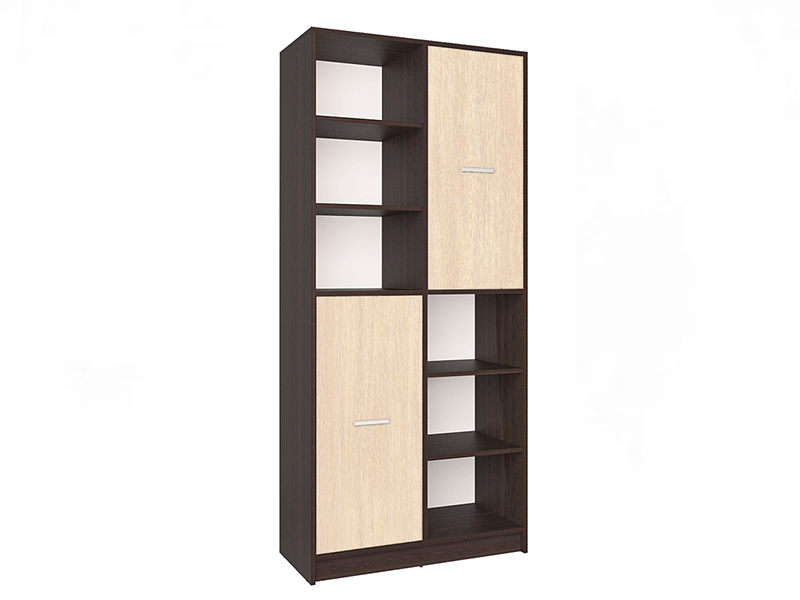Практичный вместительный шкаф из ЛДСП в контрастной расцветке. Конструкция имеет в общей сложности 10 отделений для размещения книг, журналов, техники и предметов интерьера. Данная модель шкафа имеет две открытые секции с полками и две секции с распашной дверью, общая глубина 42 см позволяет использовать шкаф в качестве стеллажа. Шкаф-стеллаж поможет систематизировать и организовать свое рабочее пространство и вместить все необходимые предметы быта.