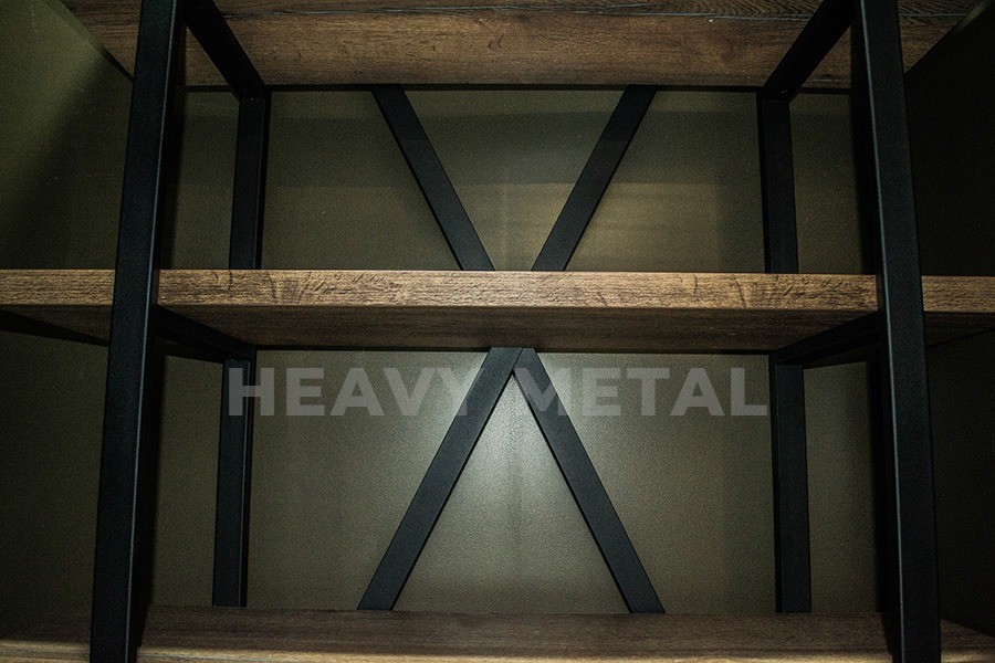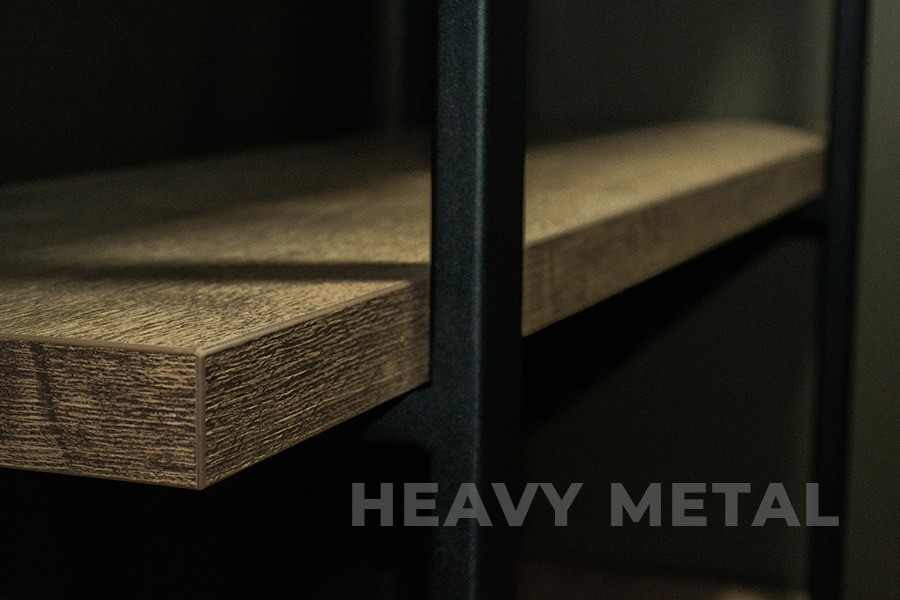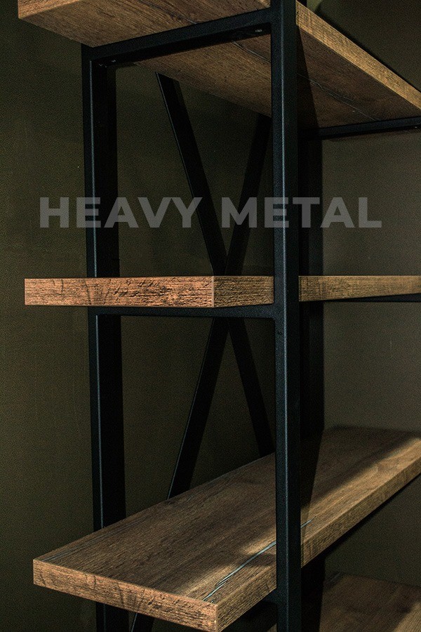 Стеллаж достаточно вместительный и практичный. Такой брутальный и дерзкий вид ему придают массивные полки толщиной 36 мм. Это даёт возможность хранить на нем, ко всему прочему и тяжелые вещи до 40 кг. (При заказе стеллажа по индивидуальным размерам нагрузка на полку может меняться).