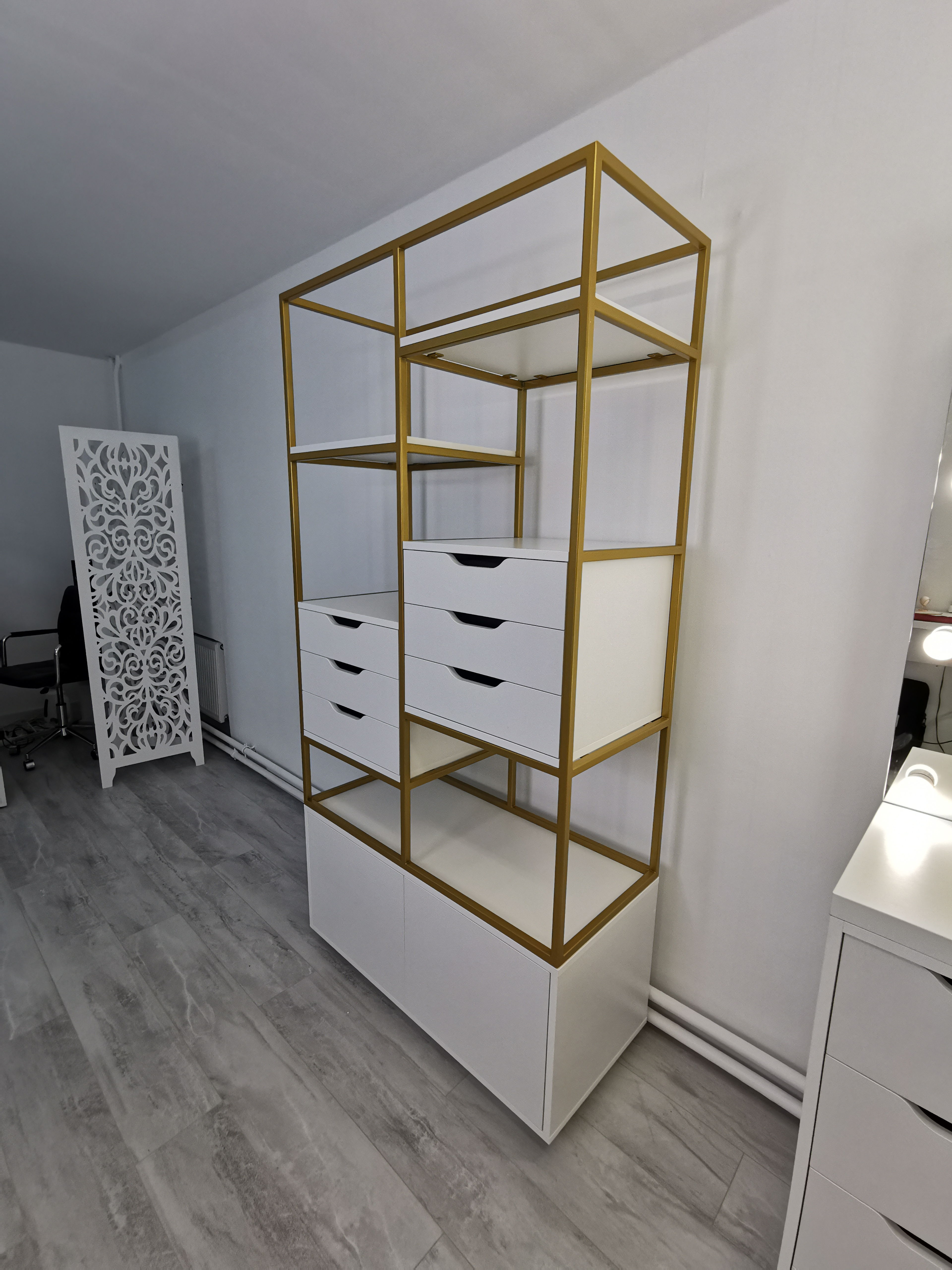 Стеллаж с выдвижными ящиками в бело-золотом цвете