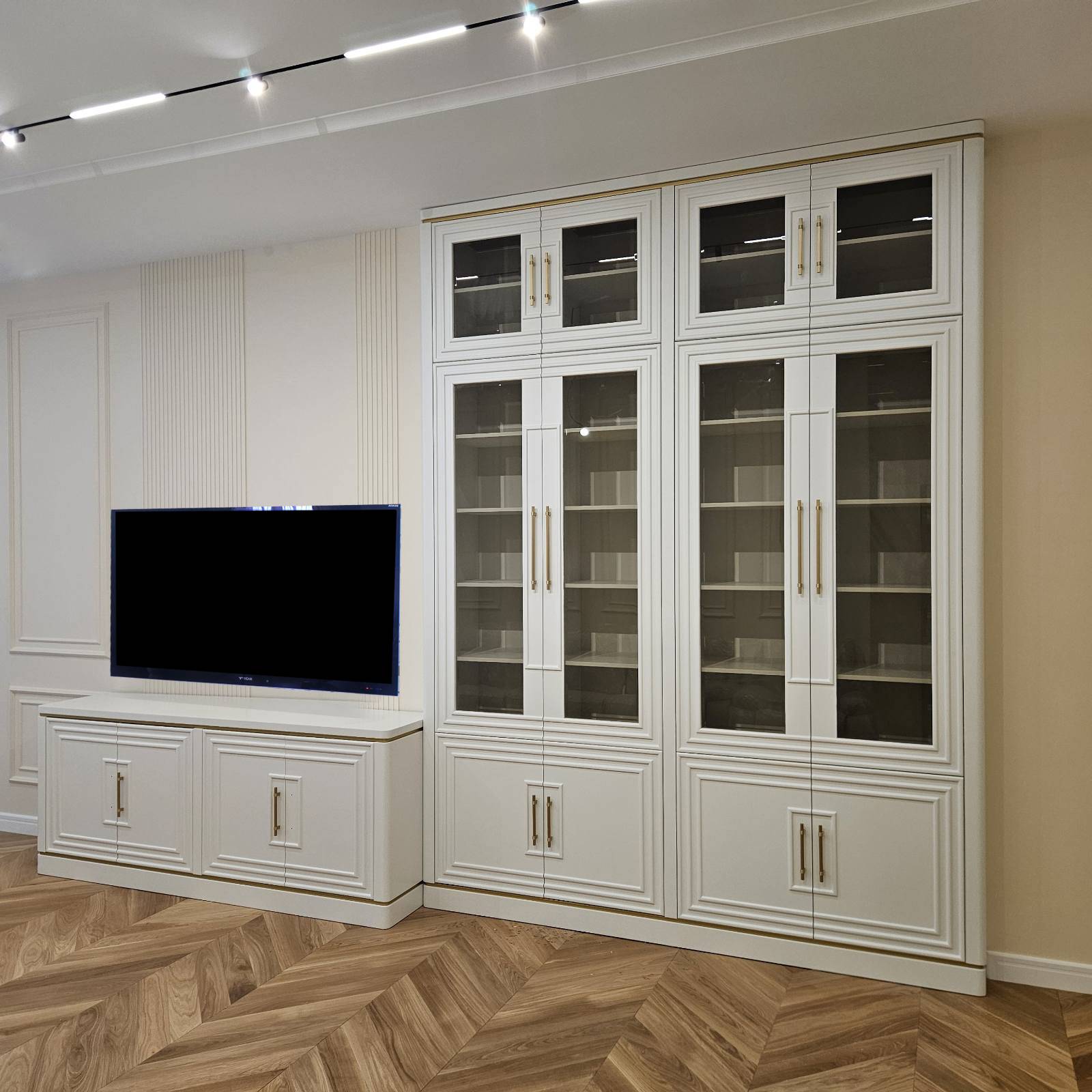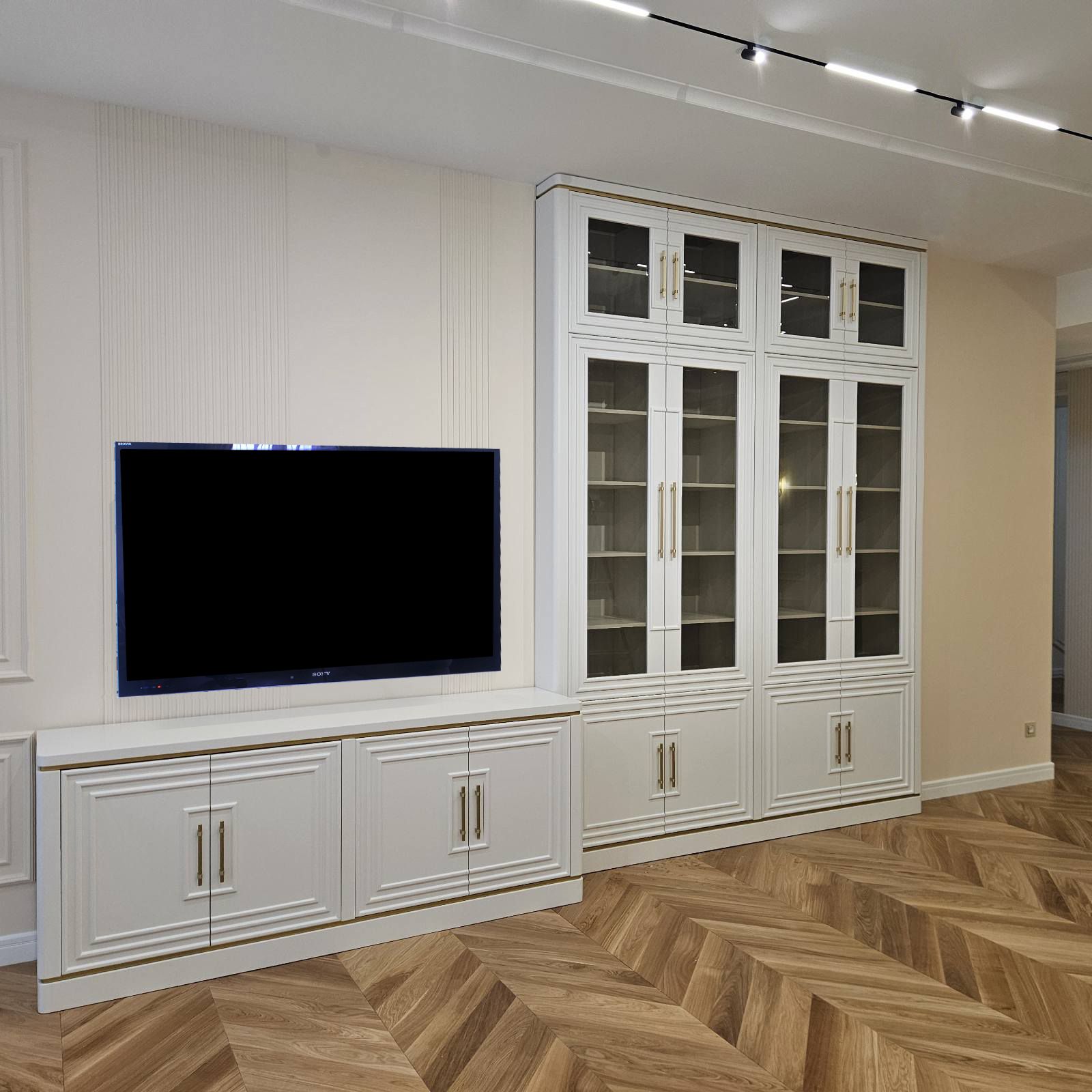 Размеры: 2130х350х1680 мм. Скругленные фасады МДФ. Широкая ниша для ТВ.