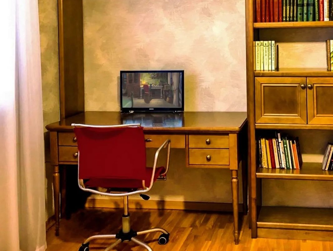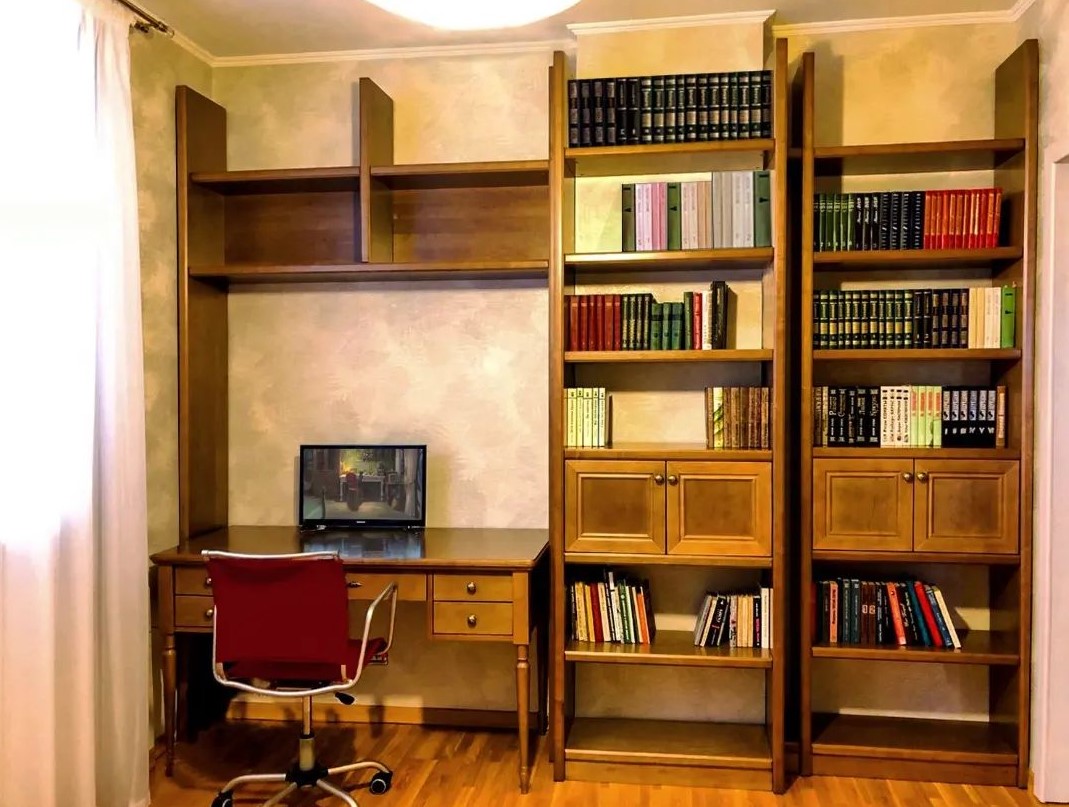 В выходной день покажем вам сделанное нами домашнее рабочее место писателя. Совсем новое, еще не засиженное музами. Удобный, красивый письменный стол и стеллаж для книг - что еще надо кроме вдохновения. Разве что диван, но он есть, стоит себе на противоположной стене. Все сделано из массива ольхи, ведь что может быть лучше деревянной мебели для себя любимого. Идея библиотеки взята у наших итальянских коллег - дизайнеров, доработана и новая мебель прекрасно стала между стен.