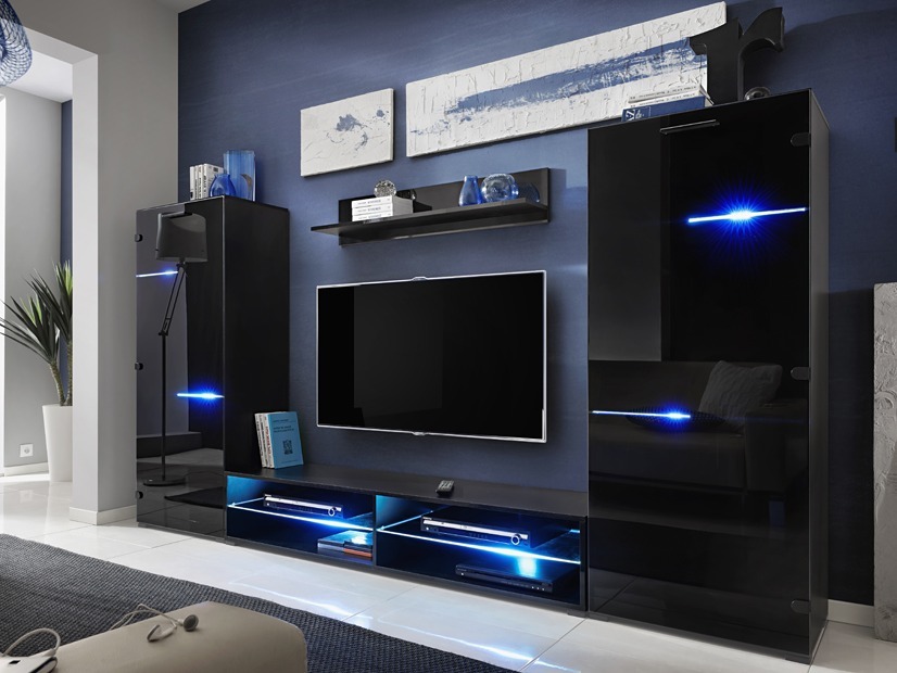 Черная гостиная с неоновой подсветкой декорирована глянцевыми переливами. Изделие представлено в стильном современном дизайне. В нижней части есть ниши для электроприборов. Над местом под телевизор располагается полка, на которую можно поставить элементы декора.