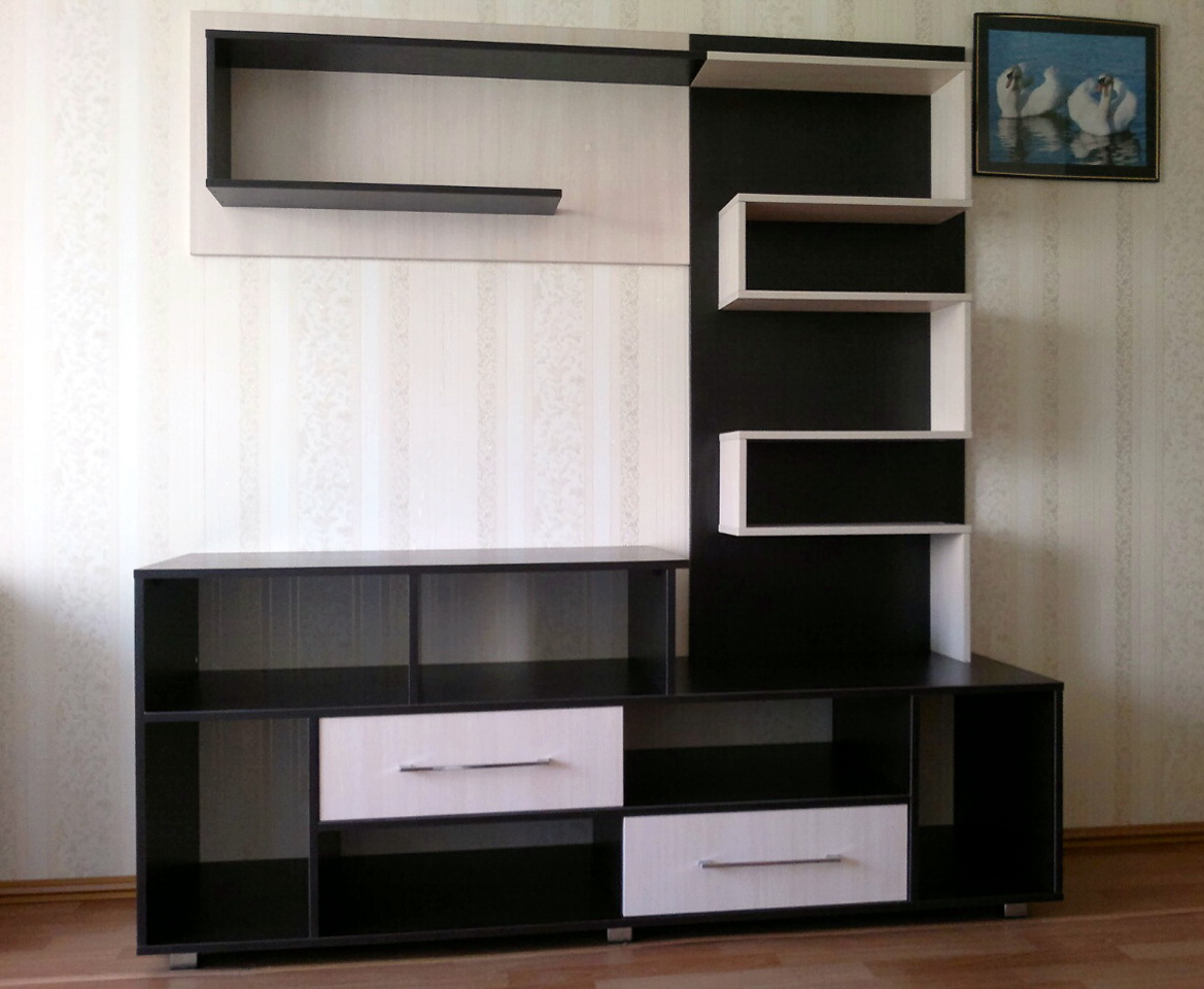 Современная стенка в гостиную с нишей для ТВ, выдвижными ящиками, распашными шкафчиками и открытыми полками.
