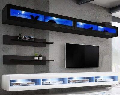 Коллекция модульной мебели с белыми глянцевыми фасадами для гостиной. Материал: МДФ, ЛДСП.
