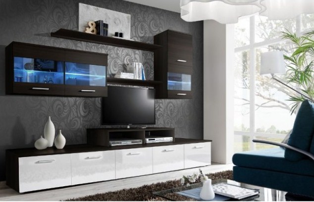 Горка для гостиной совмещает в себе широкую напольную тумбу под ТВ с белым глянцевым фасадом в корпусе под темное дерево в тон другим модулям, бескаркасные навесные полки и шкафчики с частичным несущим остеклением со встроенной подсветкой. Тумба дополнена невысокой подставкой для телевизора с двумя нишами для аудио и видео техники или игровых консолей.