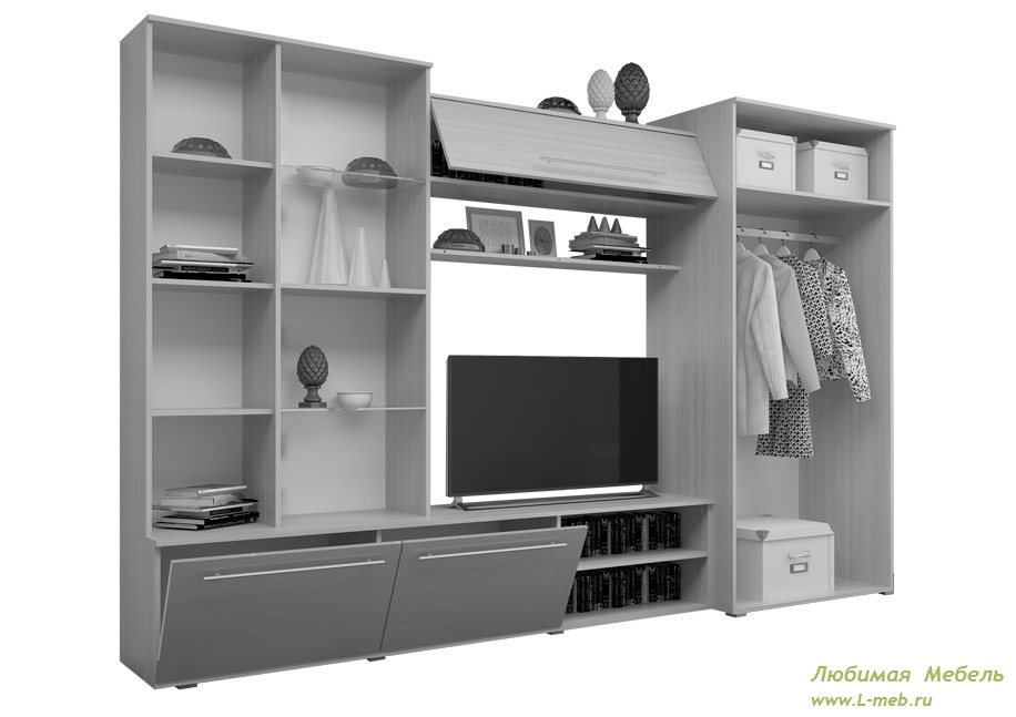 Очень вместительная и удобная горка в гостиную, состоящая из высокого стеллажа с разными размерами ячеек, нескольких открытых полок и гардеробного отдела с вешалкой. Также в набор входит эргономичный комод на два отделения и длинная антресоль, которые оснащены подъемными дверцами. Широкая ниша позволяет установить ТВ с большой диагональю.
