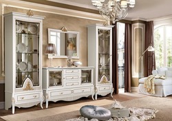 В состав комплекта входит: шкаф, шкаф с витриной, тумба, полка навесная.