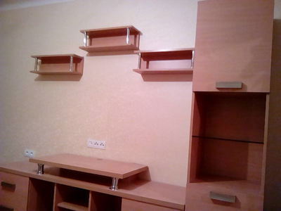 Стенка состоит из множества полочек, ниш и вместительных выдвижных ящиков. Полка под ТВ крепится на металлические хромированные опоры.