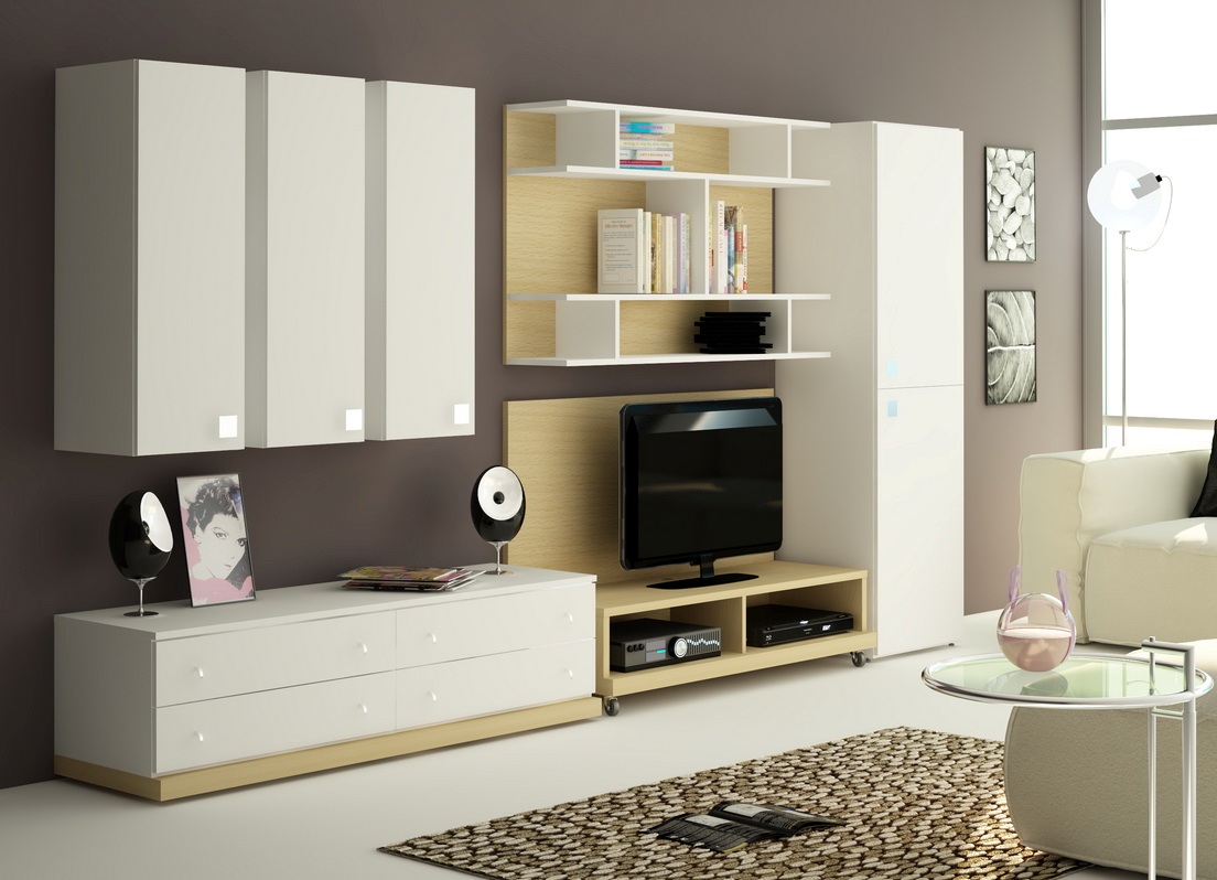 Набор из большого количества функциональных модулей в светлой цветовой гамме. Тумба для ТВ с колесиками. Полки на комоде и дверцы на шкафах оборудованны удобными ручками белого цвета.