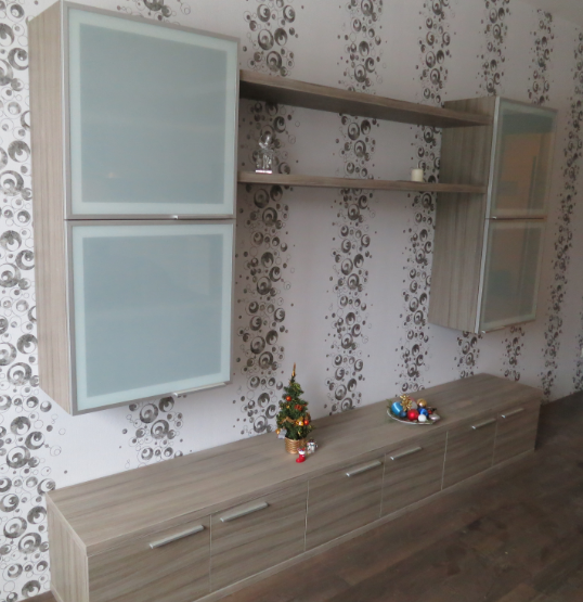 код 82508Стильная горка в пастельных тонах. Навесные шкафы со стеклом лакомат.
