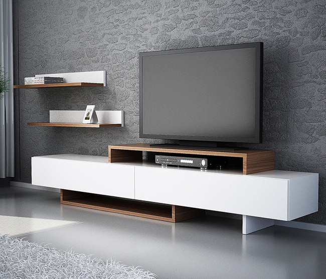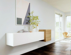 Линейная горка для зала с компактным напольным модулем из белого матового комода на плоском каркасе, образующим стойку и две сквозных ниши светлого древесного оттенка в тон навесным полкам. Фасад без ручек. Размеры: 180х100х35см.
