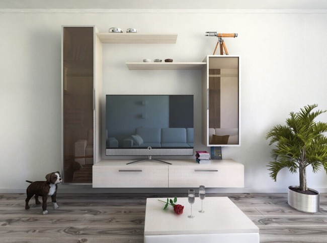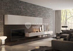 Минималистичная горка для зала с раздельными подвесными секциями и затемненными витринами. Корпус тумбы для ТВ на две дверцы изготовлен в расцветке светлого дерева. Вертикальные застекленные модули разной высоты оборудованы внутри функциональными полками и дополнены с торцов полками бескаркасными. Оригинальной особенностью данного набора для гостиной является отсутствие ручек на фасадах.