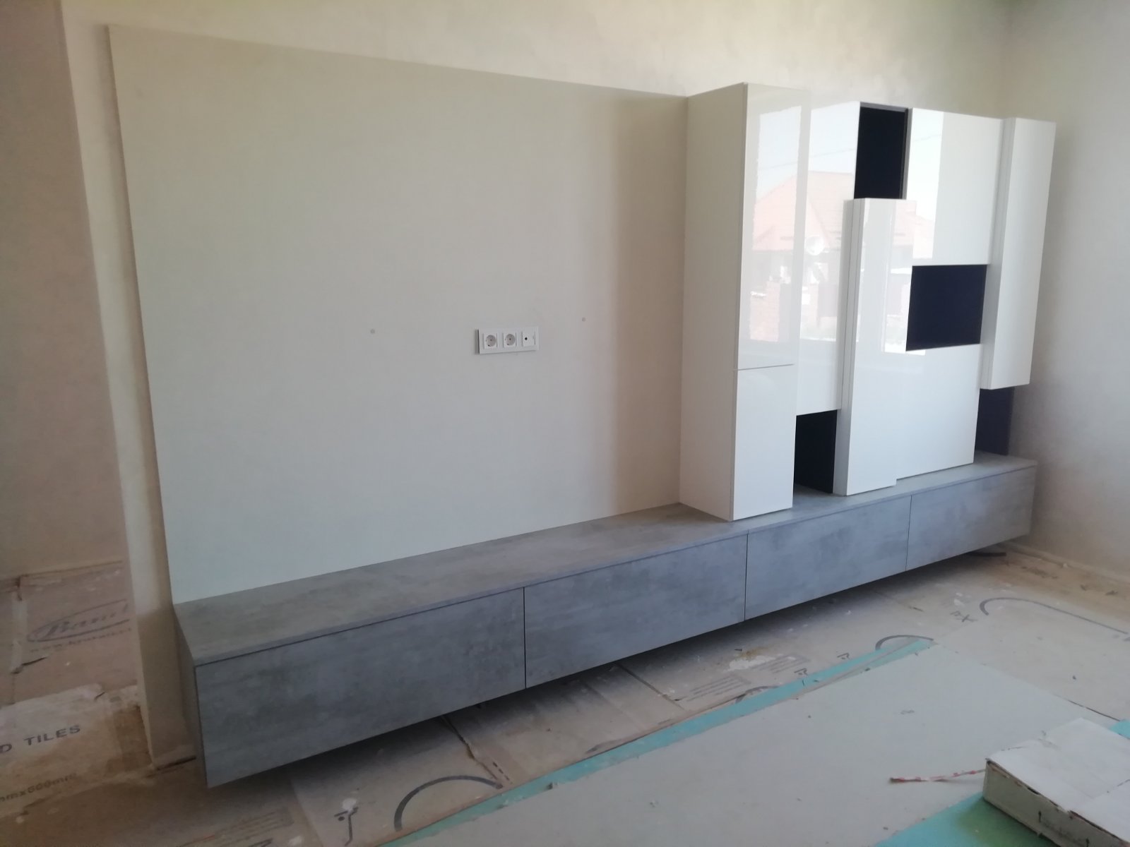 Подвесная горка в гостиную в современном стиле с белыми фасадами