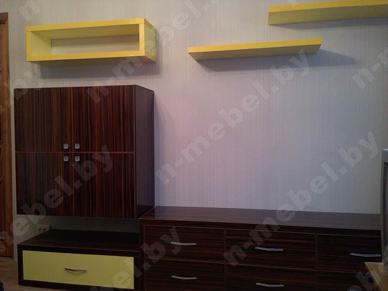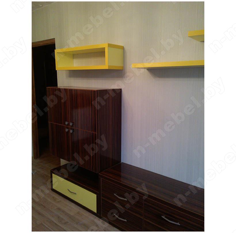 Стильная современная горка, отличается оригинальным внешним видом за счет открытых полок ярко-желтого цвета. Напольный ряд оснащен несколькими выдвижными ящиками с металлическими ручками. Подвесная часть конструкции кроме открытых полок представлена удобным шкафчиком квадратной формы с миниатюрными ручками.