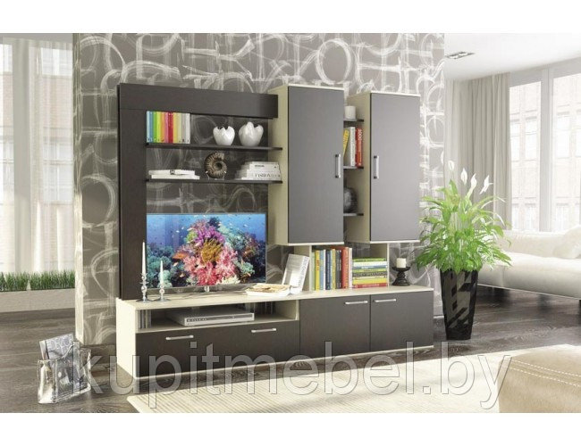 код 86057Стенка с эффектными черными матовыми фасадами на навесных модулях и выдвижных ящиках.