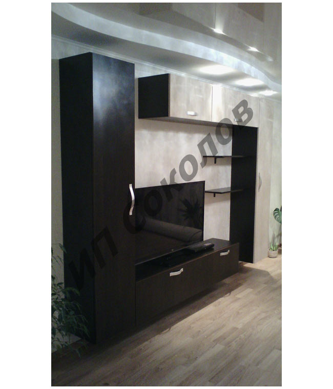Горка в гостиную состоит из нескольких модулей цвета венге и серебристого. Каркасы ящиков изготовлены из ламинированного ДСП, фасады – из МДФ. В состав набора также входят две небольшие полочки. Нижние горизонтальные тумбы играют роль места под TV.
