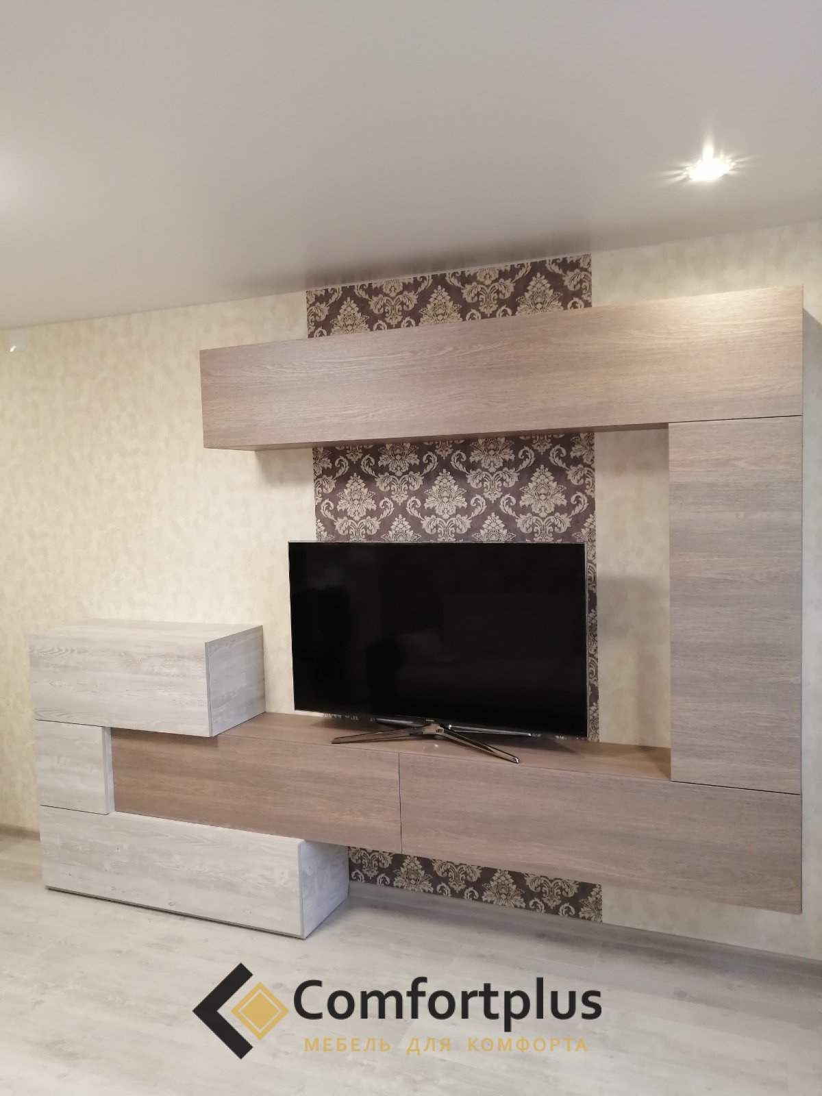 Широкое место для ТВ, подвесные модули, фасады под дерево.
