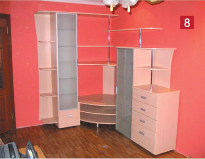 Комплектуется горка радиусной стильной тумбой под ТВ, множеством полок на металлических хромированных опорах, комодом с четырьмя выдвижными ящиками и закстекленными секциями, где можно удобно расположить любимые книги.