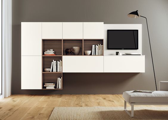 код 113323Белые фасады без ручек, открытые ниши для книг и декора, ниша для размещения ТВ.