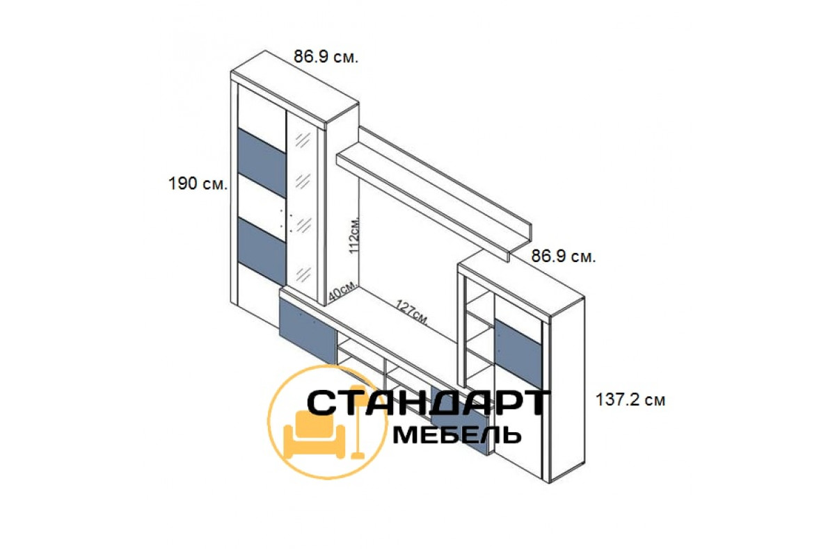- Тумба РТВ - 1 шт. Состоит из открытого отделения и двух отделений за откидными дверьми. Открытое отделение разделено перегородкой и вкладными полками на четыре секции. Вертикальные опорные стенки корпуса соединены горизонтальными крышками. Передняя часть тумбы имеет декоративное оформление в виде горизонтального цоколя. Тумба устанавливается на пластиковые ножки.