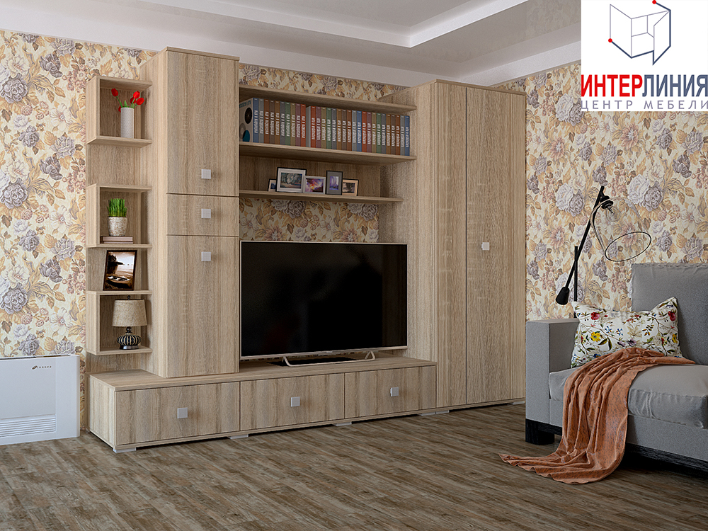 Гостиная «Аризона 4» может выполняться в нескольких цветовых вариациях. Конструкция включает в себя высокий вещевой шкаф с распашной створкой, вместительные закрытые секции и несколько открытых полок. В центральной части стенки имеется место для телевизора.