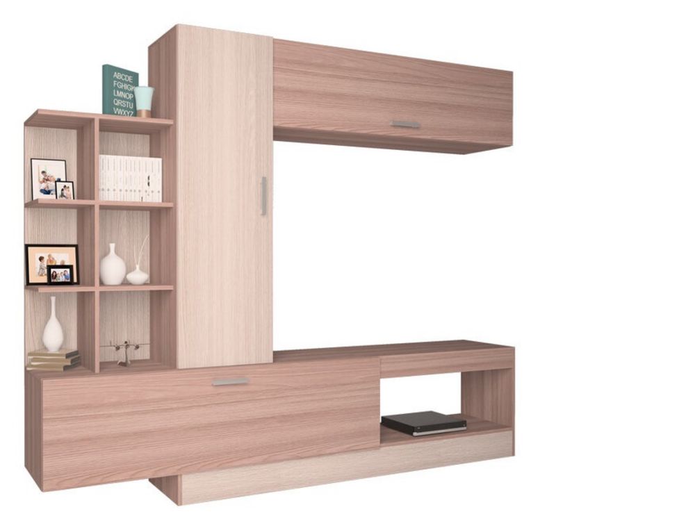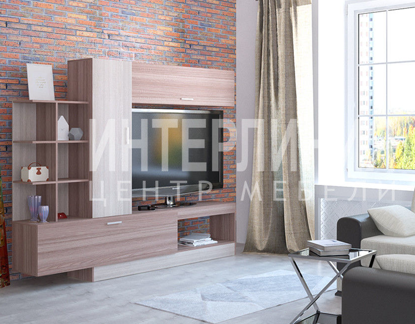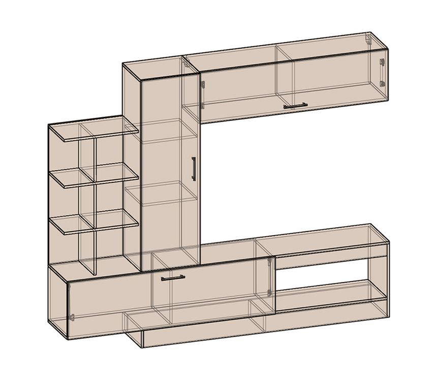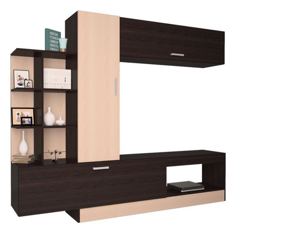 Комплект состоящий из центральной секции, пенала и шкафа. Наличие книжных полок, ниши для ТВ, ящиков и шкафчиков.