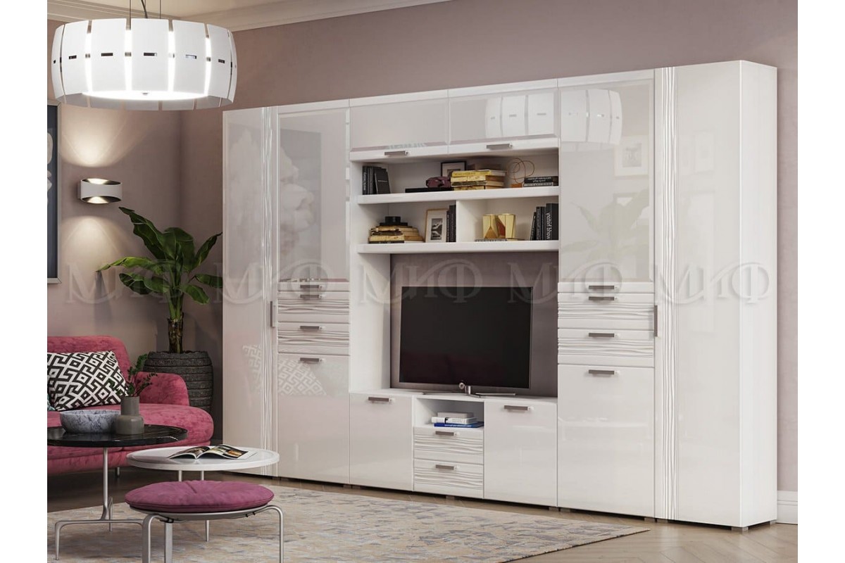 Вместительная система хранения, наличие тумбы для ТВ, открытых полок и шкафчиков.