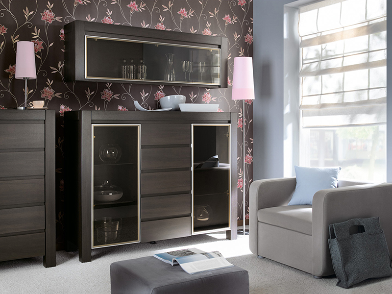 Коллекция мебели в классическом стиле с витринами. Материал: ЛДСП, облицовочный профиль из МДФ.