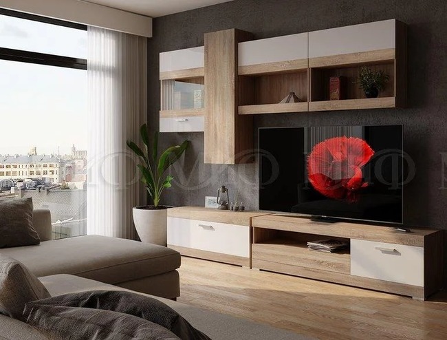 код 109155Навесные шкафы позволяют регулировать размер ТВ-ниши.