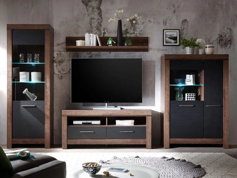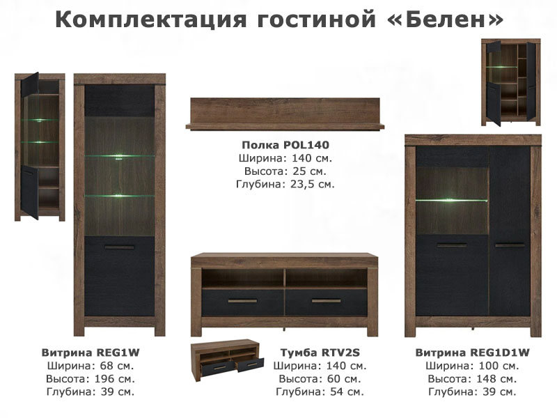 Набор мебели «Белен» поможет создать оригинальный интерьер гостиной. Темные структурные фасады в сочетании с массивным каркасом с отделкой под дерево выглядят стильно и строго. Визуально облегчают конструкцию витрины с подсветкой стеклянных полок. Интересно выглядят и устойчивые ножки, продолжающие корпус.