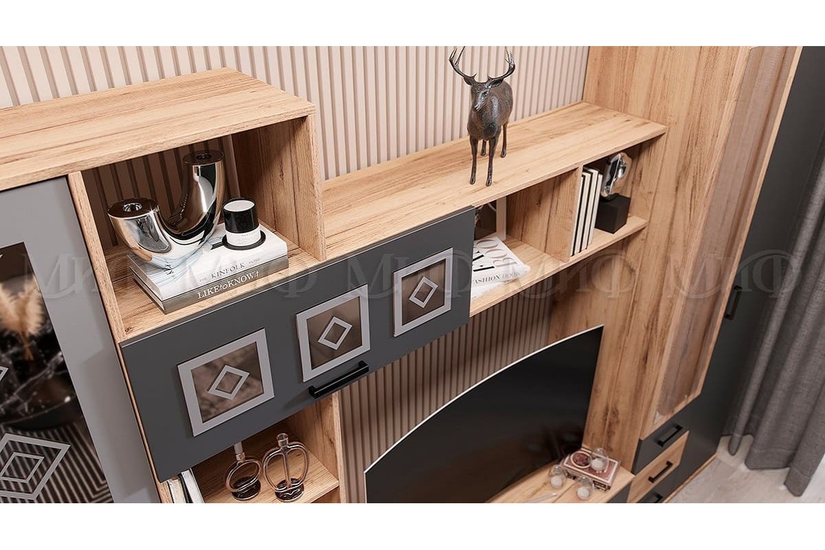 - Центральная секция Белла Графит - Дуб крафт золотой. Размеры: Ш-2000 В-2120 Г-470 мм, ниша под ТВ Ш-1184 В-1012 мм.