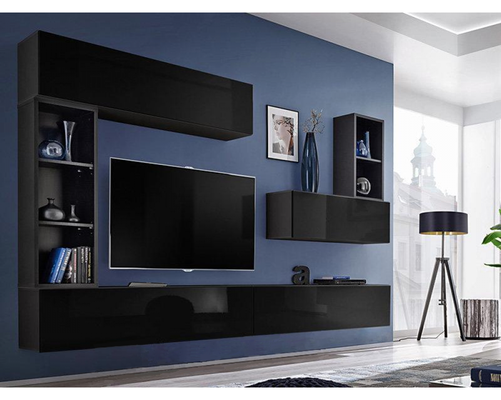 Два остекленных стеллажа, ТВ-тумба, комод, журнальный стол, подвесные полки.