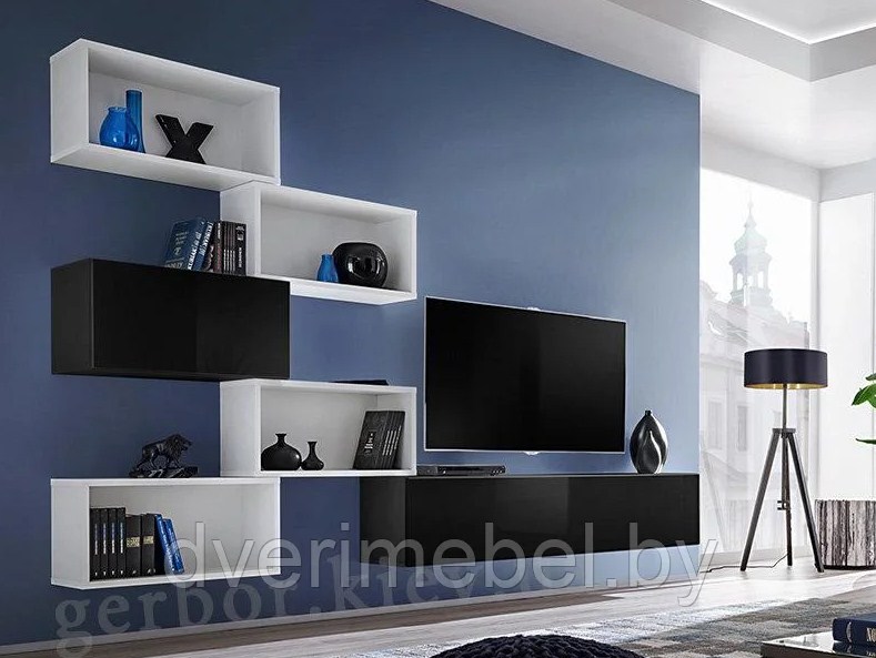 Контрастное сочетание цветов. Подвесная тумба для ТВ, витрина и два пенала.