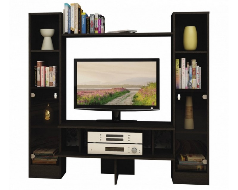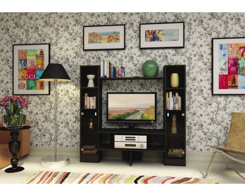 Вместительная система хранения, наличие тумбы для ТВ, открытых полок и шкафчиков.