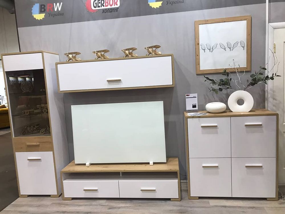 Гостиная БУКА Гербор – комплект мебели в гостиную модульной системы Buka от фабрики Gerbor-холдинг. Изготавливается из ламинированной ДСП толщиной 16 мм (крышка – 22 мм) в эффектном цветовом сочетании нимфея альба / дуб артизан. Характеризуется простыми геометрическими формами, выразительными боковинами, переходящими в интересные ножки, и удлиненными пластиковыми ручками PalMet. Используются навесные петли HAFELE. Витрина оснащена встроенной подсветкой.