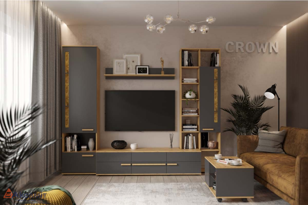 Гостиная CROWN с древесной текстурой корпусов Дуб Золотистый, монохромными матовыми фасадами Графит и декоративными вставками ручной работы с использованием прозрачной эпоксидной смолы сочетает в себе последние модные тренды.