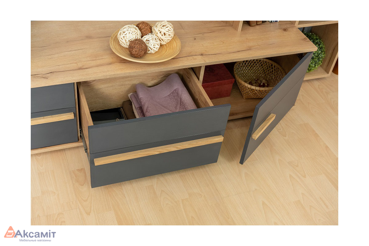 - Тумба ТВ Crown 3 (Дуб Золотистый/Графит). Габариты (ШхГхВ) в мм - 1680х469х398