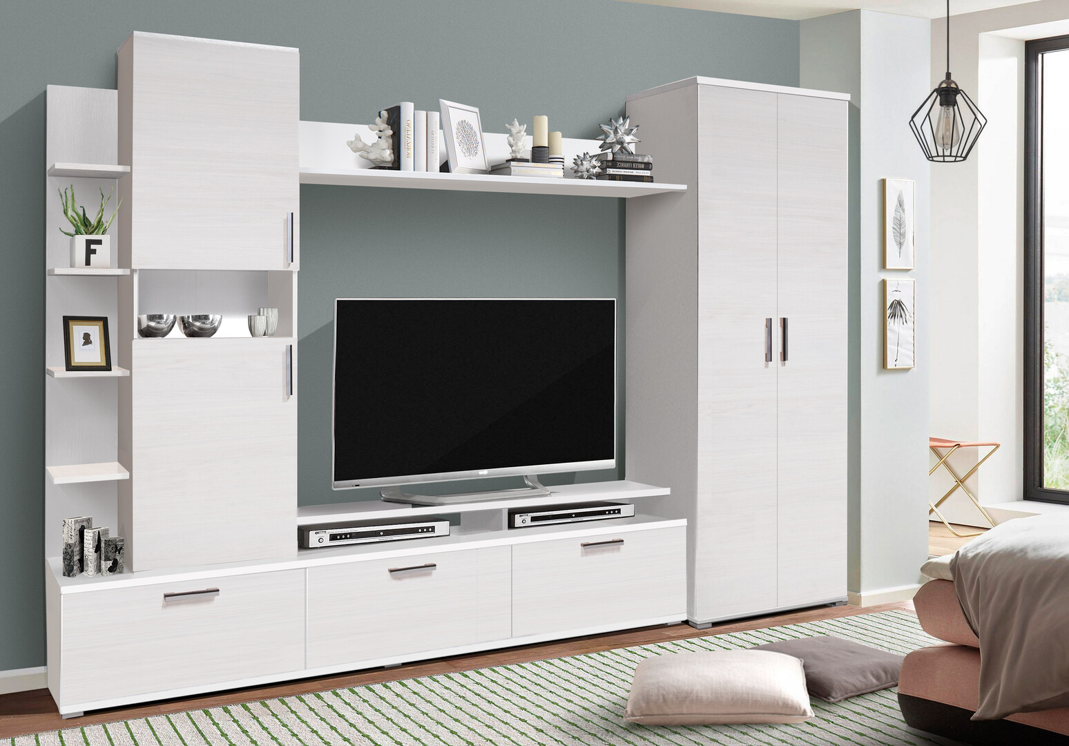 Создайте уютную и современную атмосферу в доме с гостиной «Денвер Нью». Сочетание анкор ясень светлый и белого цвета делает интерьер визуально просторнее, добавляя свежести и легкости. Эта мебель не только украсит ваш дом, но и обеспечит удобное хранение вещей, книг, бытовой техники и декора.