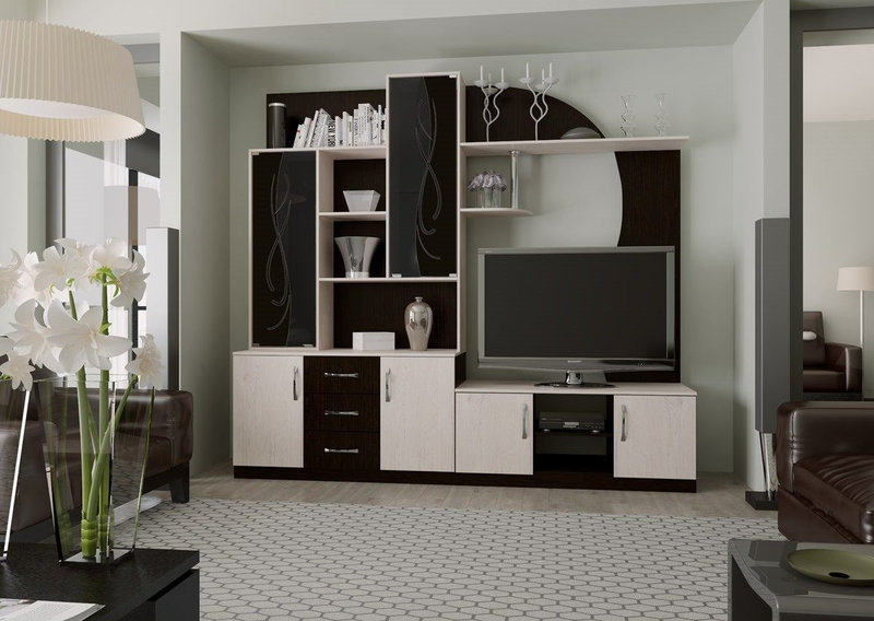 Роскошная модульная коллекция мебели с "волнистыми" фасадами для гостиной. Материал: МДФ покрытый плёнкой, ЛДСП.