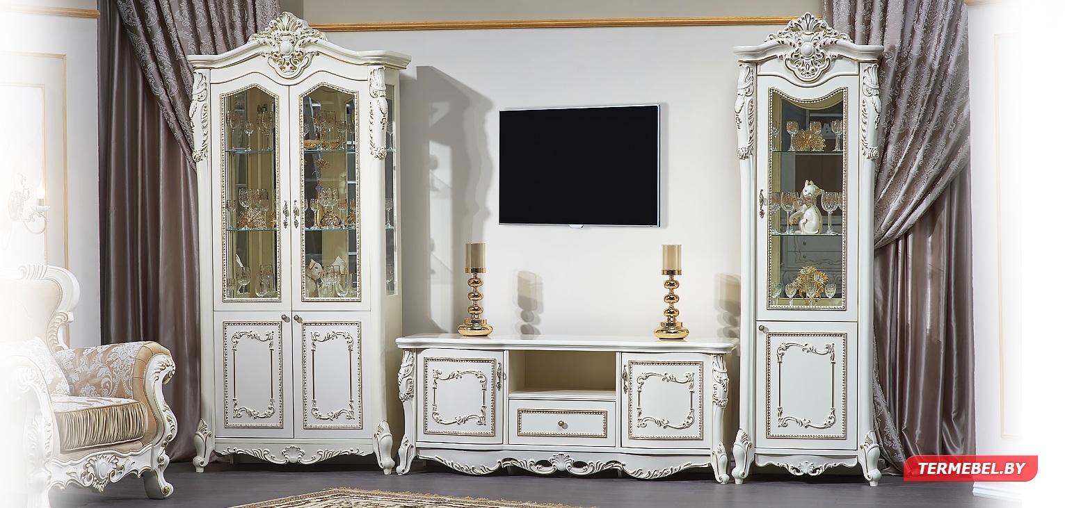 код 103499Изящная гостиная в классическом стиле. Фасады радиусные: МДФ с фрезеровкой и шелкографией.
