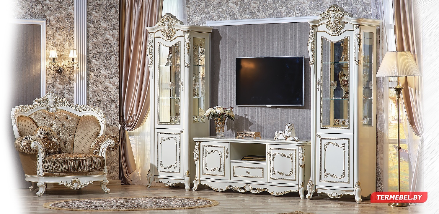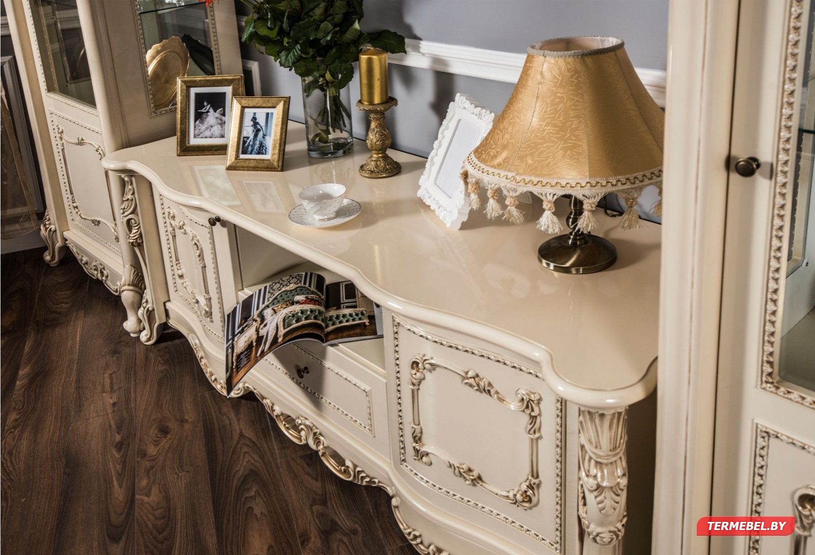 - Декоративные элементы, фасады, накладки покрыты золотой, темной патиной и матовым лаком.