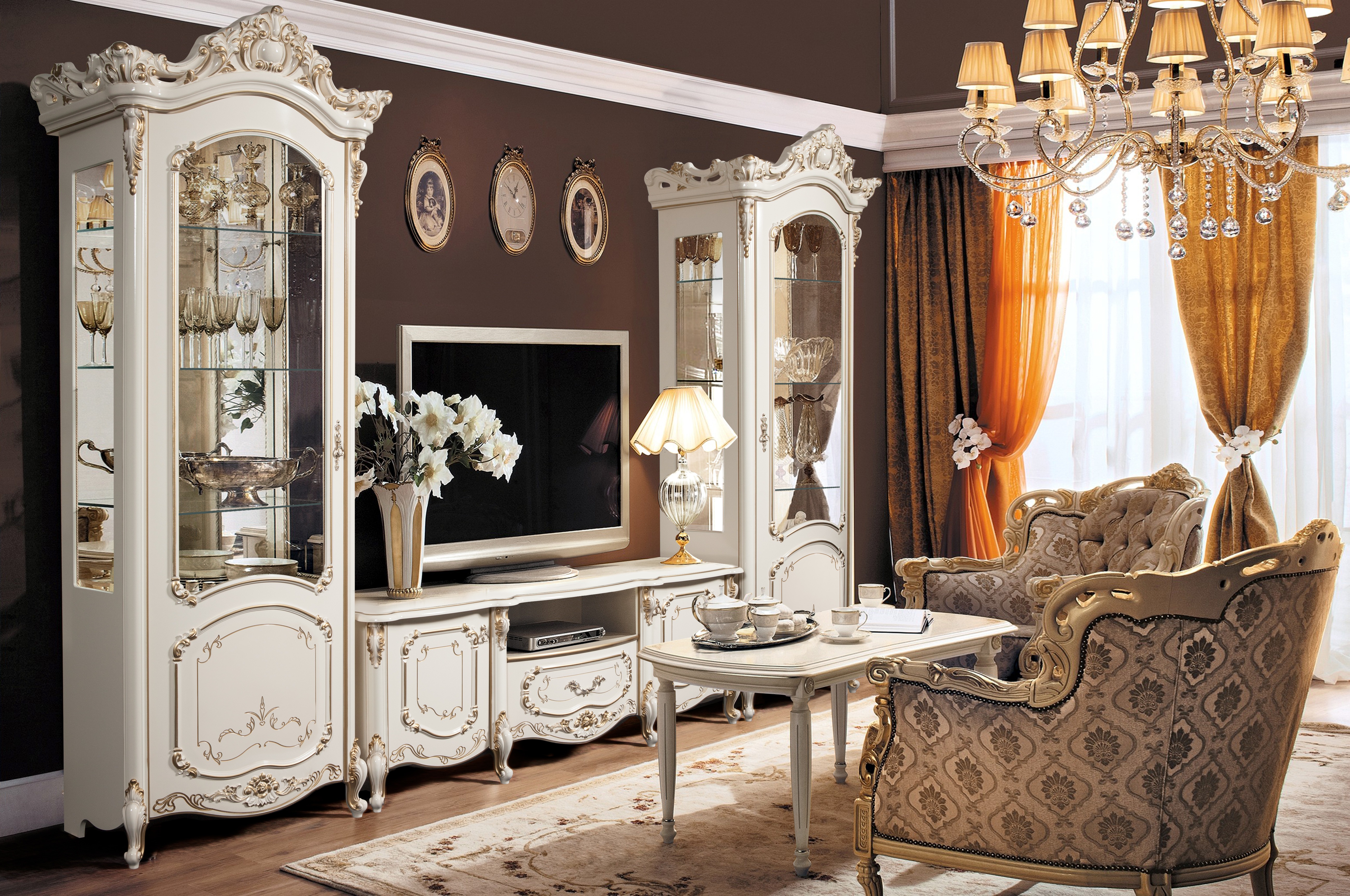 Модульная коллекция мебели в классическом стиле для гостиной. Материал: МДФ покрытый плёнкой, ЛДСП.