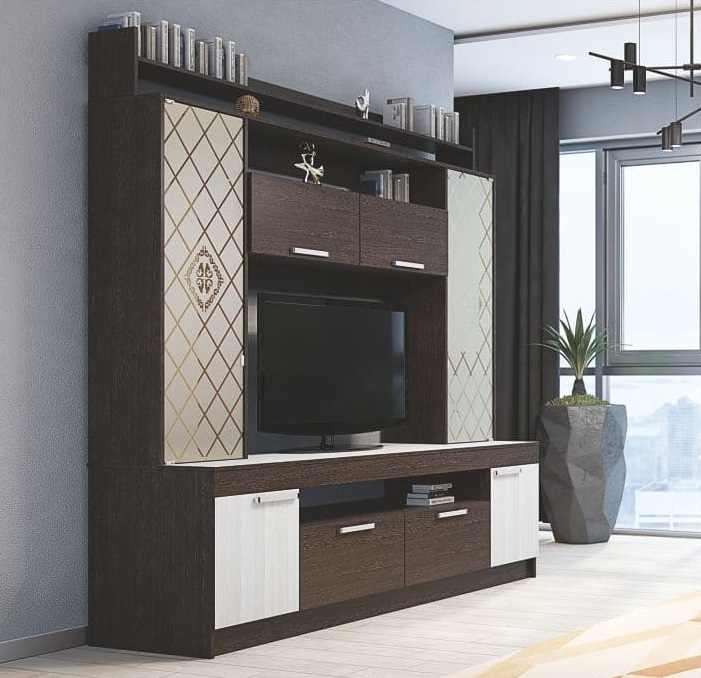 Модульная гостиная состоит из тумбы под телевизор, шкафа, стеллажа и двух навесных полок