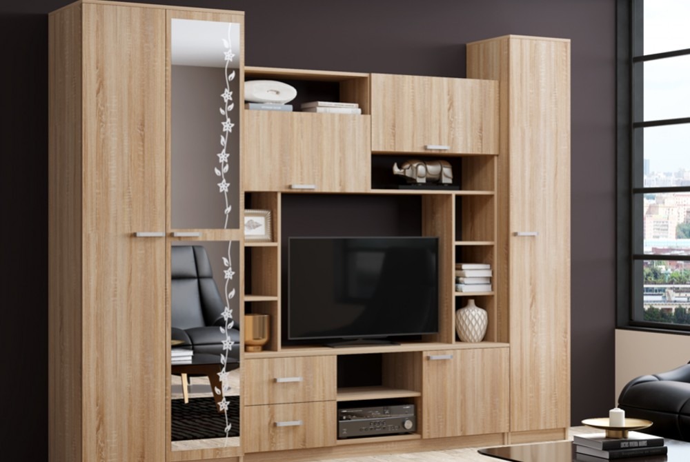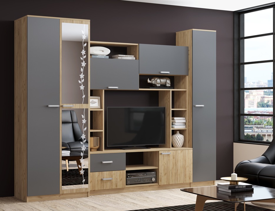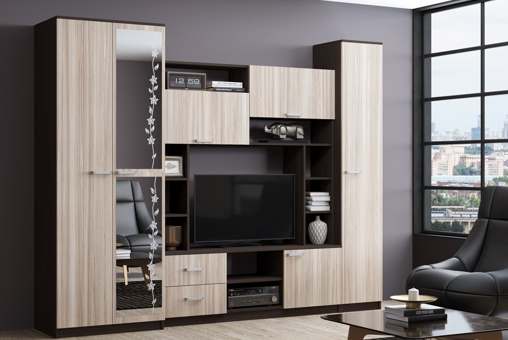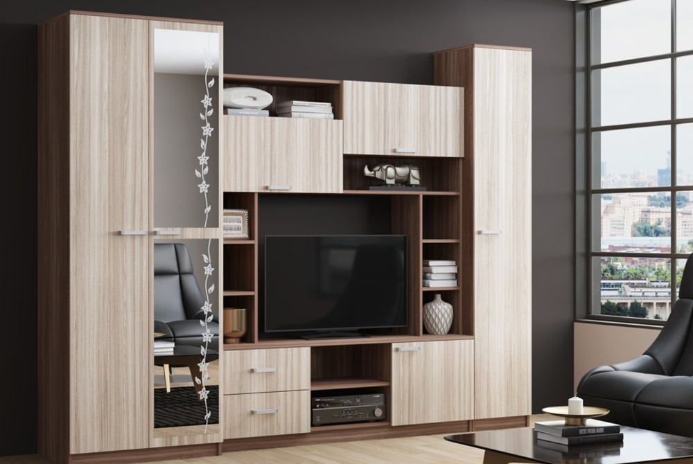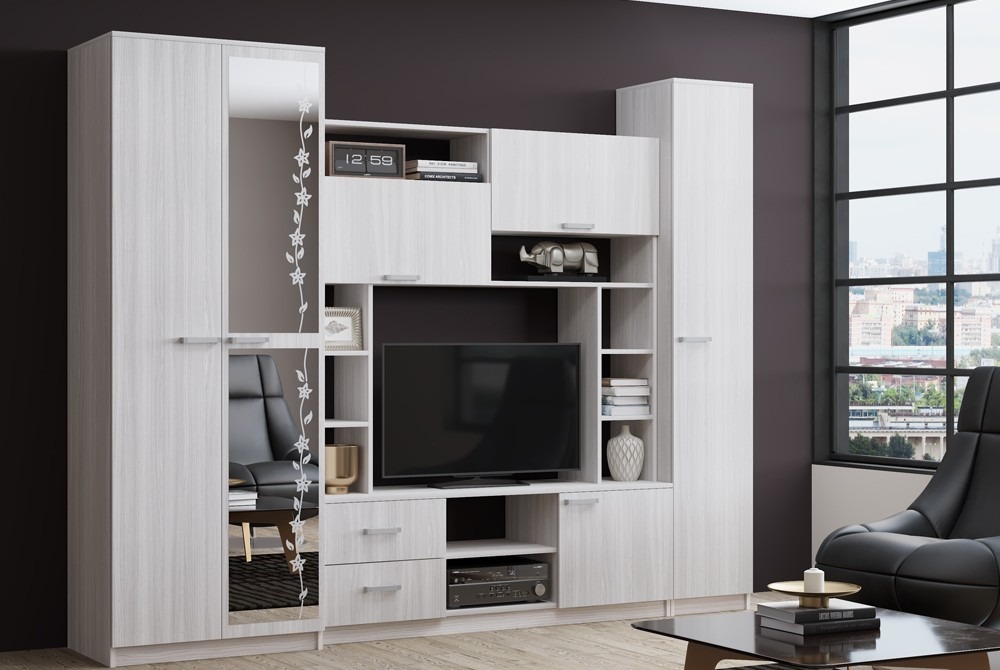 Модель Флора 1— вариант модели Флора в других вариантах цвета. В этой модели есть все необходимое: шкаф двухстворчатый распашной со штангой, пенал с полками, центральная часть с полками и ТВ нишей.