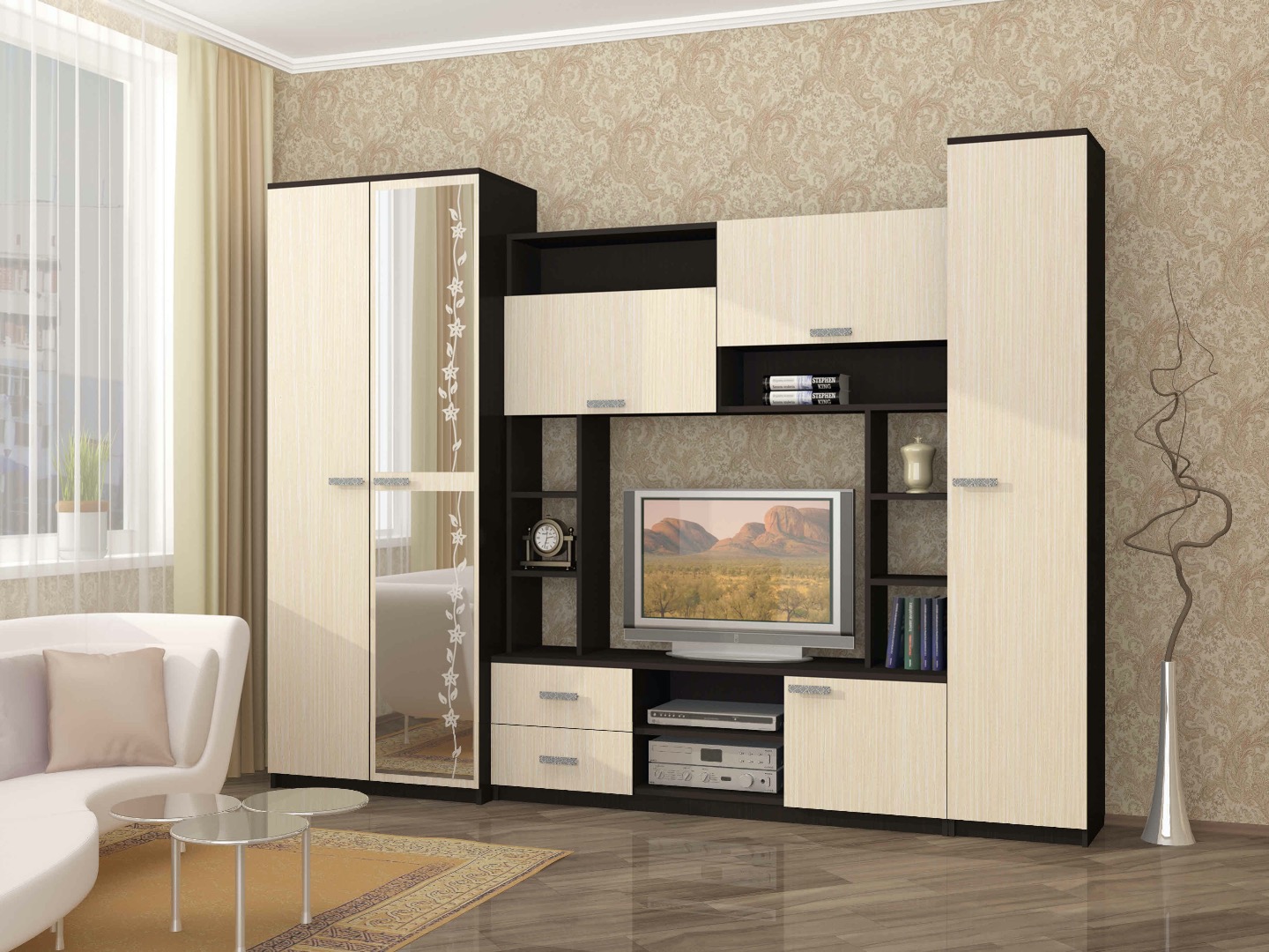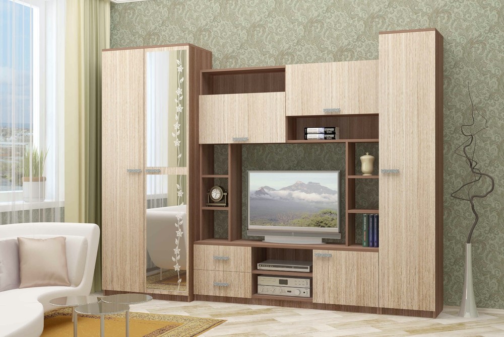 Модульная коллекция мебели для обустройства гостиной. Материал: ЛДСП, МДФ покрытый плёнкой.