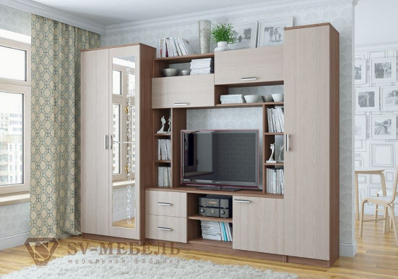 Секция в зал «Гостиная 3» (ex. Гамма 16) выполнена в темном корпусе с фасадами цвета млечного дуба. Створки распашного шкафа украшает высокая зеркальная вставка. В центральной части имеется место для телевизора.