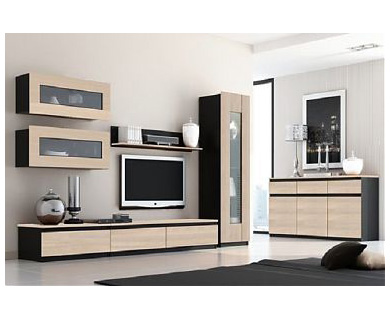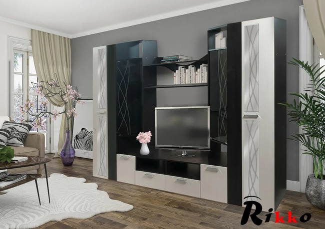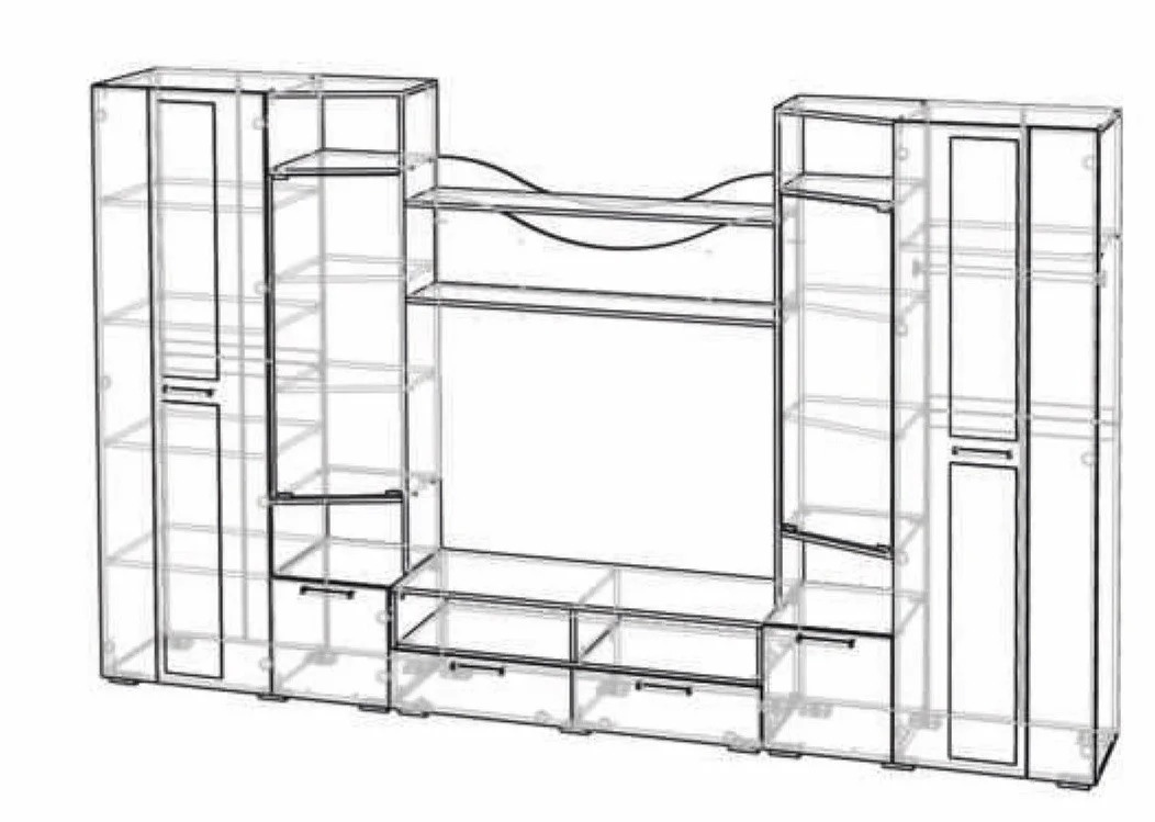 код 109804В комплект входит два вместительных шкафа, тумба ТВ, витрины и полки.