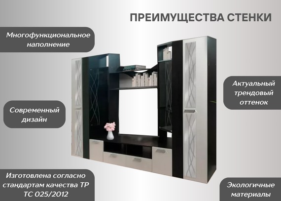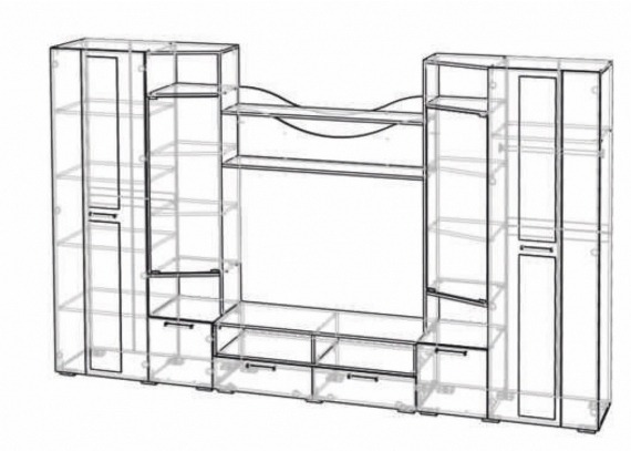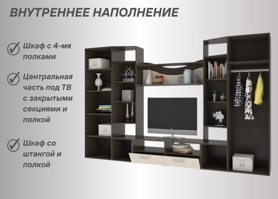 Функциональность стенки представлена наличием множества открытых и закрытых полок.